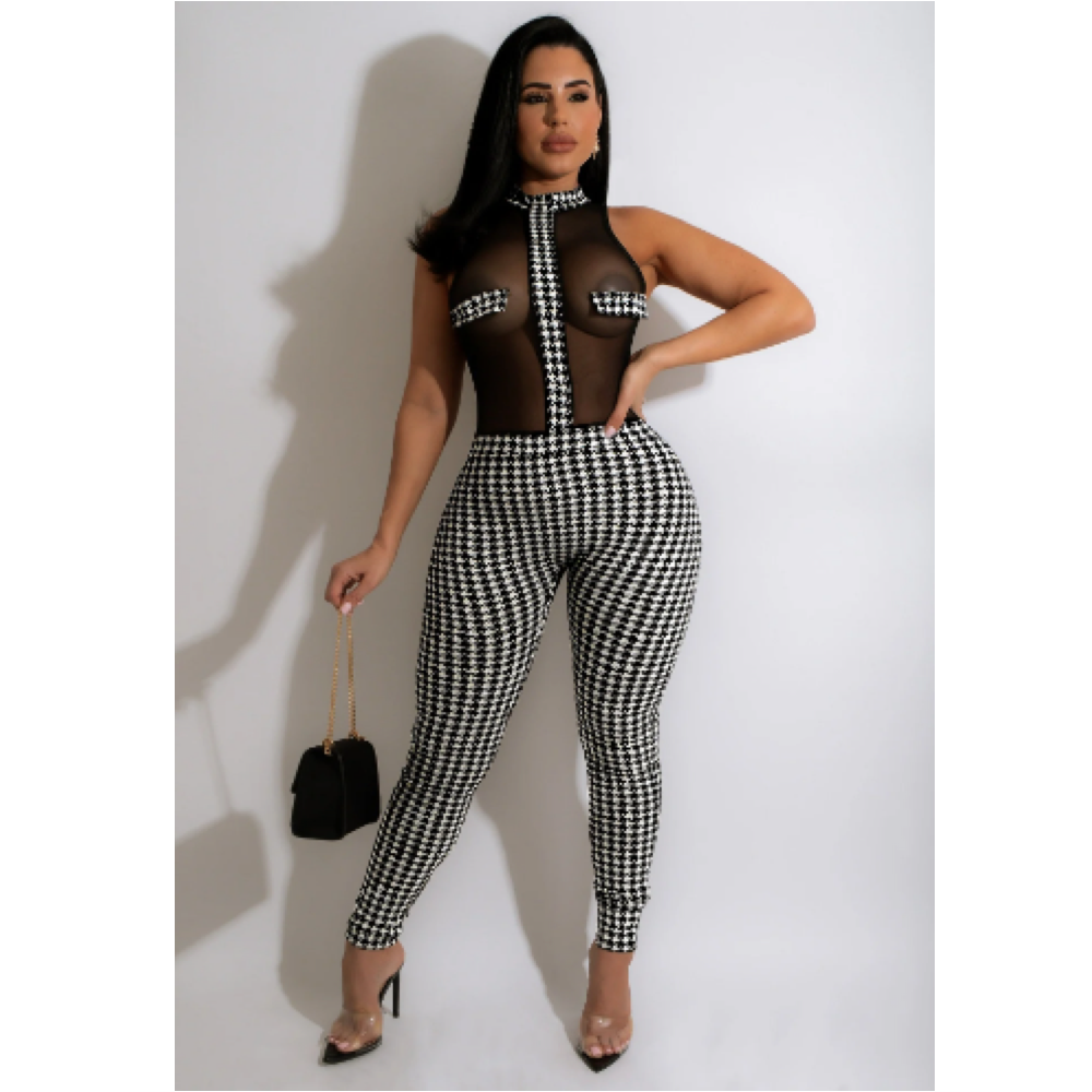 Mono empalmado de pata de gallo de malla transparente para mujer, peto sin mangas de una sola botonadura para fiesta, traje Retro Y2k transparente para discoteca