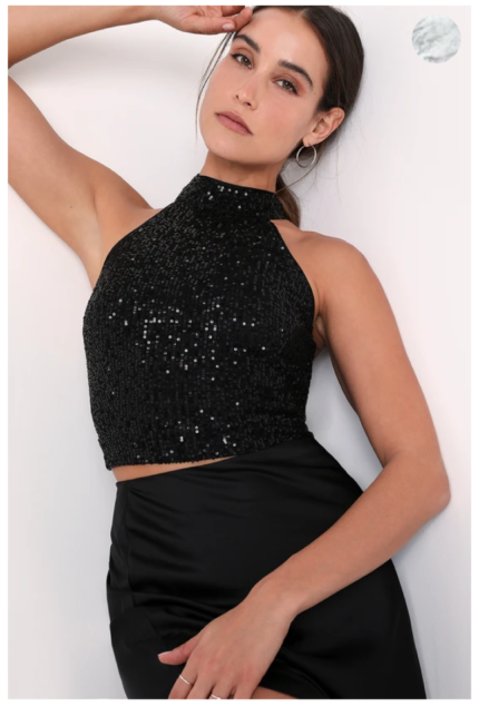 EXCLUSIVO DE LULUS! Top Corto Sin Espalda Halter Sin Mangas Con Lentejuelas Negras De Diva Behavior